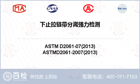 下止拉链带分离强力检测服务详情1、标准试验方法 拉链强度 ASTM D2061-2007 (2013)---拉链拉链强力项目检测2、标准试验方法 拉链使用性 ASTM D2062-2003(2014)---拉链拉链强力项目检测3、拉链规范 BS 3084:2006(R···