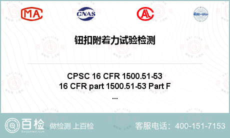 钮扣附着力检测服务详情1、8岁以下儿童的玩具及其他物品的模拟使用和滥用的测试方法 第E部分:扭矩强力 16 CFR part 1500.51-53-2008 Part E---成衣附件(揿钮,钮扣等)掀钮扭矩强力项目检测2、缝入式塑料钮扣抗撞击···