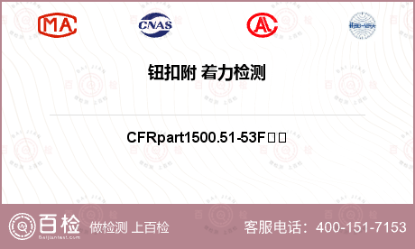 钮扣强度检测服务详情1、8岁以下儿童的玩具及其他物品的模拟使用和滥用的测试方法 第F部分:拉伸测试 16 CFR part 1500.51-53:2019 Part F---附件(拉链,揿钮,纽扣等)抗拉测试项目检测2、拉链使用性试验方法 AST···